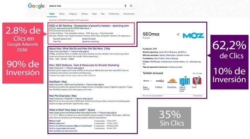 El CTR de Adwords es sólo del 2.8% vs el CTR de la sección orgánica (no paga) que puede llegar a ser del 62%.